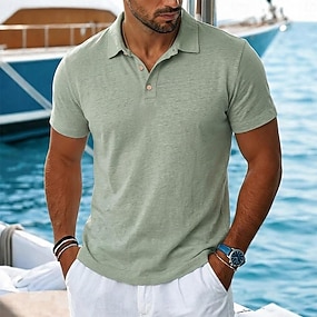 Polos en lin pour homme, style décontracté, manches courtes, à boutons, coupe classique, coloris bleu lac, noir, blanc, vert clair, rose et violet.