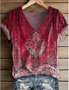 Femmes T-shirt Imprimé Graphique Paisley ancien Élégant Classique Manche Courte Col en V Hauts Réguliers Quotidien Noir Rouge Orange Parme Gris Été Printemps