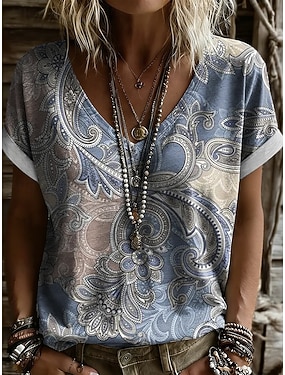 T-shirt Boho femme graphique floral vintage élégant classique à manches courtes col en V hauts longs quotidiens vêtements de vacances impression bleue violette fuchsia verte été printemps