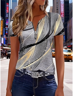 Femmes T-shirt Fermeture éclair Imprimé Graphique Géométrique Mode Moderne Occasionnel Manche Courte Col en V Hauts Longs Quotidien Sortir Week-end Gris Été Printemps