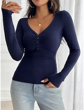 Femmes T-shirt Haut Long en Coton Boutons Uni Élégant Basique Classique manche longue Col en V Hauts Réguliers Quotidien Sortir Week-end Bleu Noir Vin Fuchsia Printemps Automne