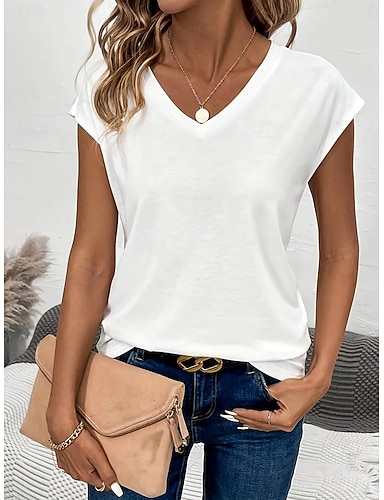 Femme T shirt Couleur unie Plein Basique basique Décontractées Manche Courte Col V Hauts réguliers du quotidien Imprimer Rose Claire Eté