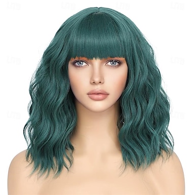 bob perruque avec frange courte ondulée bleu perruque femmes synthétique couleur baccalauréat perruques longueur d'épaule fête Halloween Noël amusant cosplay perruques
