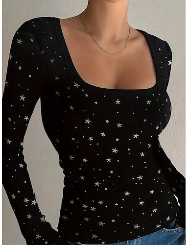 Femmes Chemisier Etoile Élégant Occasionnel manche longue Col en U Hauts Réguliers Quotidien Imprimé Noir Printemps Automne Hiver