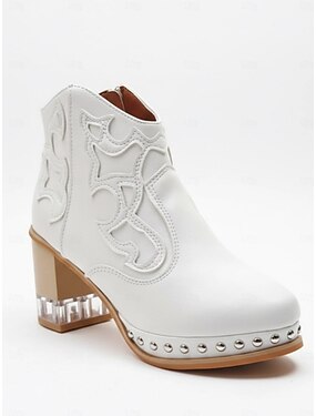 bottines western en cuir blanc pour femme - bordure cloutée, motif brodé et talon épais en bois pour des tenues décontractées tendance