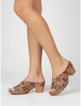Sandales à talons carrés imprimées style ethnique pour femmes – mules colorées à bout ouvert, idéales pour les vacances, les festivals et les tenues estivales décontractées.