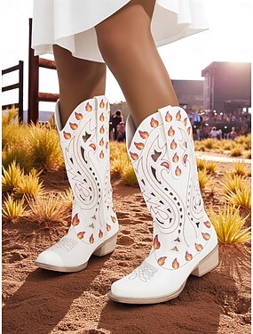 Bottes de cowboy western noires brodées de flammes pour femmes - bottes de festival rétro à hauteur du genou avec talon bas pour festivals de musique, costumes d'Halloween et cosplay