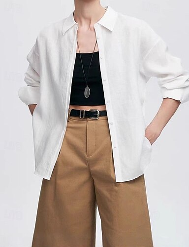 Femmes Chemises en coton et lin Chemisier Boutons Uni Élégant manche longue Col de chemise Hauts Réguliers Quotidien Travail Fête Bleu Blanche Rose Claire Printemps Automne