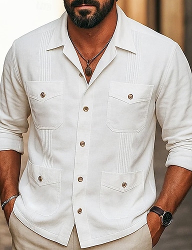 Homme Chemise Chemise en lin Chemise Guayabera Chemise d'été Chemise de Plage Chemise Boutonnée Uni Vacances Occasionnel Blanche manche longue Col Camp Été Printemps Vêtement Tenue Avec Poches