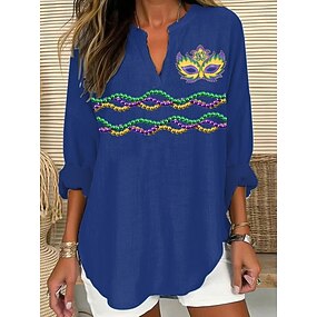 Chemise Femme Mardi Gras Lin Comme Respirant Léger Graphique Vintage Quotidien Chic Manches Longues Col V Hauts Normaux Imprimé Vacances Bleu Noir Blanc Jaune Violet Été Printemps