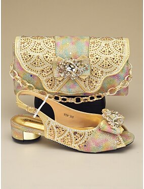 Ensemble de talons slingback en strass dorés pour femmes et pochette assortie, tenue de soirée ornée de paillettes pour les événements de cocktail