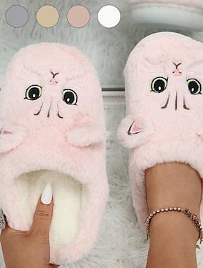 pantoufles en peluche pour femmes avec tête de chat - pantoufles d'intérieur confortables en fourrure avec de jolies oreilles et une broderie pour la maison en hiver