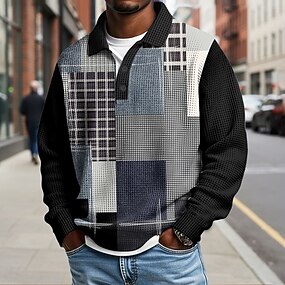 Homme Bloc de Couleur À carreaux Chemises Polo Gaufre manche longue Polos Revers Vêtements de sport Occasionnel École Athleisure Tenue quotidienne Impression 3D Printemps Automne Bleu Bleu Clair Gris