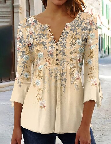 Femme Chemise Chemisier Floral Bohême Décontractées manche longue Col V Hauts réguliers du quotidien Imprimer Jaune Rose Claire bleu marine Bleu Orange Eté Printemps Automne