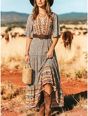 Femmes Robe Midi Robe bohème Robe Vintage Robe Décontractée Robe Fleurie Élégant Mode Moderne Extérieur Vacances Sortir Coupe régulière Fleuri Manche Courte Col en V Bleu Jaune Rouge Été Printemps