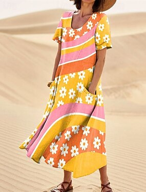 Femmes Robe Midi Robe Fleurie Robe Imprimée Mode Moderne Vacances Quotidien Week-end Coupe régulière Rayé Fleur Demi Manches Col ras du cou Jaune Rose Claire Bleu clair Été