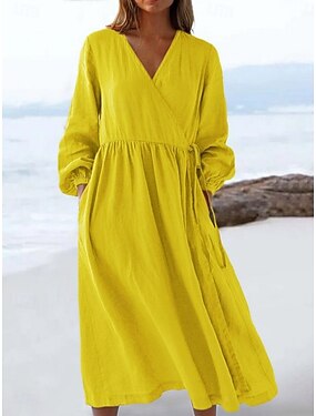 Femmes Noir Blanche Jaune Été Printemps Robe maxi Robes inspirées du lin Robe Blanche Robe Décontractée Basique Moderne Quotidien Week-end Coupe Ample Uni Col en V