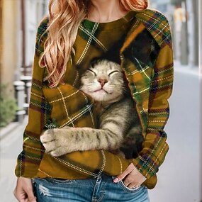 pull femme sweat plaid chat décontracté sportswear festival col rond manches longues haut micro-élastique automne& hiver