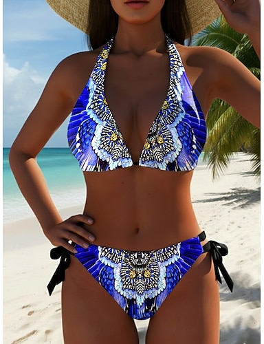 Maillot de bain deux pièces pour femmes bikini boho sexy taille haute rétro géométrique décolleté en V sans manches