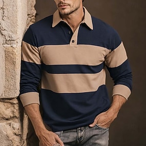Homme Rayé Polo de rugby manche longue Polos Chemises à Col Vêtements de sport Occasionnel École Extérieur Bureau Tenue quotidienne Boutons Printemps Automne Hiver Blanche Bleu Marron