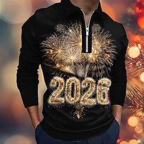 Nouvel An Homme Feux d'artifice Polo manche longue Polos Revers Occasionnel Tenue quotidienne Tenue de fête Impression 3D Polo à fermeture éclair 1/4 Printemps Automne Hiver Noir