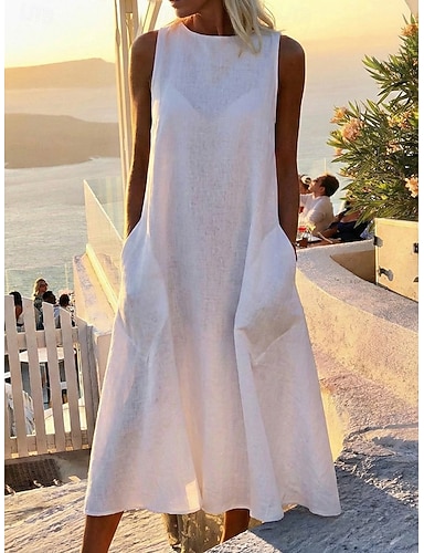 robe midi femme sans manches poches décontractée coupe trapèze encolure ronde blanc été polyvalent coupe régulière confortable léger respirant vêtements vêtements
