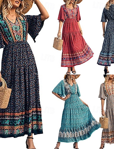Femmes Robe maxi Robe fourreau Occasionnel Boho Extérieur Sortir Coupe régulière Fleuri Manche 3/4 Col en V Arc-en-ciel Été Printemps Automne