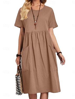 Femmes Robe Midi Robe Longue Maxi Robe Faux coton lin Robe fourreau Élégant Basique Occasionnel Quotidien Travail Vacances Coupe régulière Uni Manche Courte Col ras du cou Rose Claire Marron clair