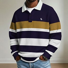 Homme Rayé Chemises Polo Gaufre Polo de rugby manche longue Polos Chemises à Col Occasionnel Athleisure Tenue quotidienne Boutons Printemps Automne Hiver Bleu Blanche Violet Claire