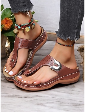 sandales tongs en similicuir marron pour femmes avec design perforé et accent métallique pour une tenue décontractée et des sorties estivales