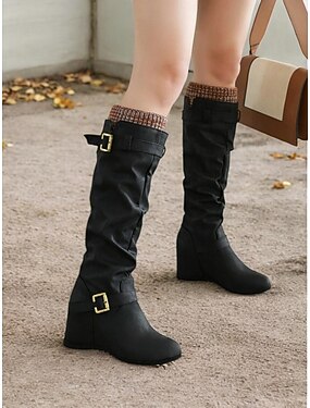 bottes hautes souples pour femmes en cuir marron vieilli avec brides à boucle et talon compensé – bottes d'hiver confortables avec revers en tricot pour les tenues décontractées