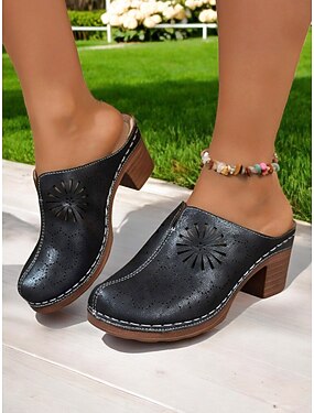 Chaussures mules à talon carré perforé pour femme – style rétro chic pour les garden-parties, les promenades décontractées et les loisirs en plein air