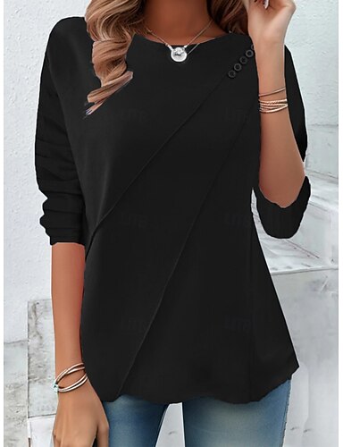 T-shirt femme à manches longues couleur unie élégante décontractée col rond réguliers tops quotidiens boutons noir jaune rouge bleu printemps préautomne