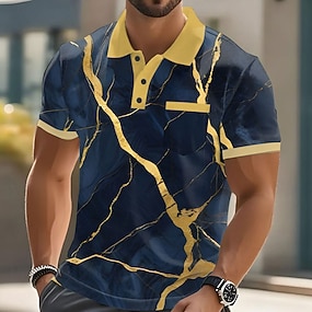 Homme Marbre Polo Manche Courte Polos Chemises à Col Vêtement décontracté de travaile Extérieur Athleisure Tenue quotidienne Avec Poches Impression 3D Boutons Été Bleu Bleu Clair Dorée