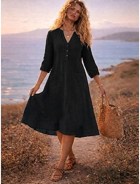 Femmes Robe Midi Faux coton lin Robe Caftan Mode Classique Moderne Extérieur Vacances Fête Coupe régulière Uni Manche 3/4 Col en V Noir Vert Véronèse Orange Bleu de minuit Été