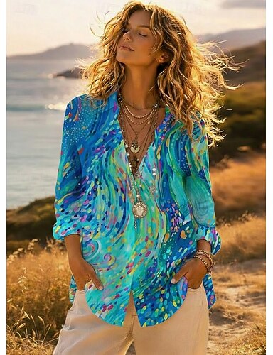Femmes Chemise Patchwork Boutons Imprimé Graphique Géométrique Occasionnel Boho manche longue Col de chemise Hauts Réguliers Quotidien Sortir Tenues de fête Arc-en-ciel Printemps, Automne, Hiver, Été