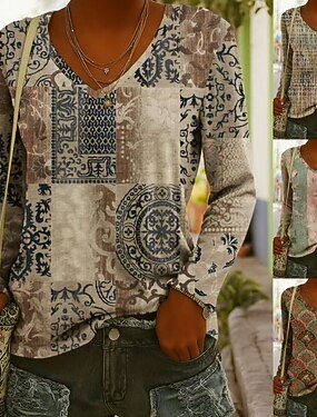 Femmes T-shirt Bohème ancien Occasionnel manche longue Col en V Hauts Réguliers Quotidien Bordeaux Rose Claire Bleu Poudré Kaki Printemps Automne