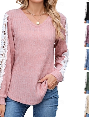 T-shirt Femme Couleur Unie Élégant Décontracté Manches Longues Col en V Tops Réguliers Quotidiens Dentelle Patchwork Bleu Noir Blanc Vert Gris Foncé Printemps Automne Hiver