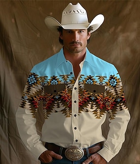 Homme Aztèque Tribal Ethique / Africain Chemise Western Chemise de cow-boy manche longue ancien Style Western Tribal Extérieur Vacances Course de Chevaux Printemps & Été Col Rabattu Imprimé Boutonné