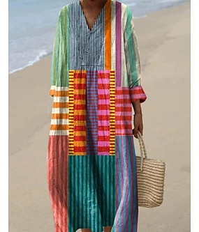 Robe Midi Femme Col V Manches Longues Kaftan Léger Coupe Ample Robe A Ligne Décontractée Boho Sortie Coupe Ample Graphique Géométrique Rayée Manches Longues Col V Cendre Noir Jaune Bleu