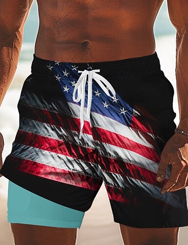 Shorts patriotique Jour de l'Indépendance pour homme Drapeau américain Doublés 2 en 1 Shorts de board Maillots de bain Taille moyenne Vacances Poches latérales Avec doublure de compression Taille