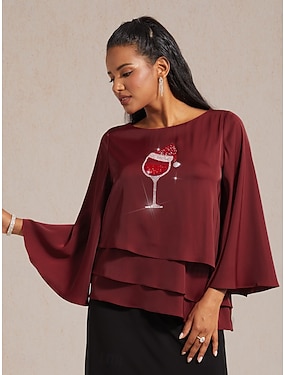 Noël Femmes Chemise en satin Chemisier Strass Verre de vin Élégant Manche 3/4 Manche cloche Col ras du cou Hauts Réguliers Tenue de soirée Sortir Vin Été Printemps Automne Hiver