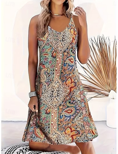 Femmes Mini Robe Robe d'Été Robe trapèze Robe d'été Vacances Occasionnel Plage Soirée Mariage Coupe régulière Fleuri Graphique Paisley Sans manches Col en U Marron clair Marron Bleu de minuit Ét