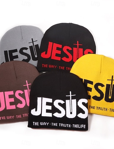 Homme Unisexe Bonnet Chapeaux d'Hiver Bonnets 骷髅头毛线帽 Chapeau Tricoté Gris noir Jaune Fibres Acryliques Jacquard Tricoté Confortable Halloween Tenue quotidienne Festival Lettre Croix Jésus Chaud