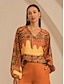 Chemise femme marron vintage bohème géométrique graphique satin soie magyar manches 3/4 col ras du cou décontracté quotidien week-end vacances printemps automne