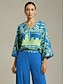 haut femme bleu satin imprimé floral vacances manches lanterne col V printemps automne décontracté