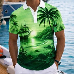 Homme Palmier Polos Hawaïens Manche Courte Polos Revers Occasionnel Athleisure Tenue quotidienne Vêtements de vacances Impression 3D Boutons Maille Respirante Printemps & Été Bleu Marron Vert