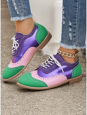 chaussures oxford multicolores pour femmes, design rétro à bout d'aile avec empiècements verts, roses et violets, richelieus à lacets décontractés pour la mode et le quotidien