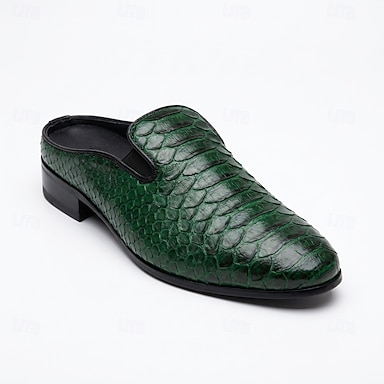Mocassins pour hommes en cuir vert et marron à motif serpent, chaussures tendance à enfiler pour les soirées en boîte de nuit et les looks audacieux.