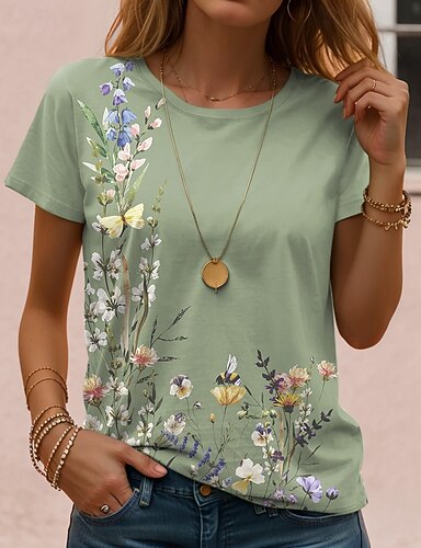 Femmes T-shirt Imprimé Fleuri Graphique ancien Élégant Classique Manche Courte Col en V Hauts Réguliers Quotidien Frêne Noir Vert Claire Rouge Vert Été Printemps